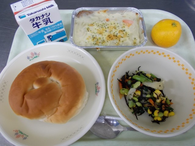 【おはなし給食】牛乳・ミルクパン・「ポテトグラタン」・ひじきとコーンのサラダ・みかん