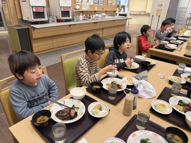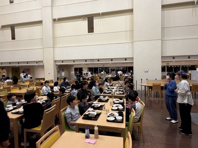 待ちに待った夕食の時間です。食事係のお友達が事前に会場入りし、全員分の配膳準備をしてくれました。みんなで元気いっぱいに「いただきます!」ができました。どのおかずも子どもたちの人気メニューばかりです。