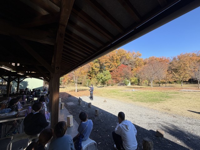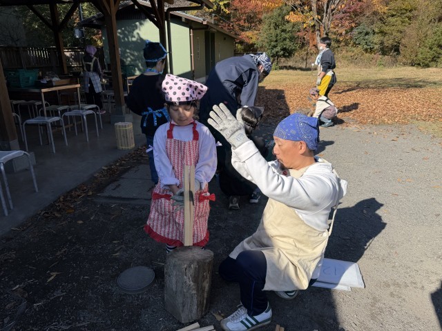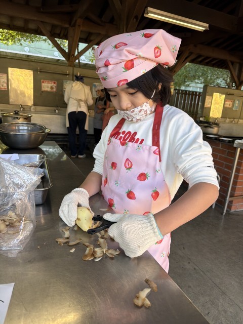 高尾の美しい紅葉に包まれた絶好の環境の中、いよいよ野外炊爨が始まりました。受付で食材を受け取り、薪割りなどの説明を聞いた後は、担任と一緒に下準備に取りかかりました。