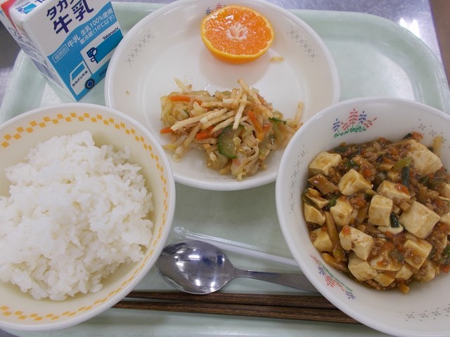 牛乳・ごはん・カレーマーボー・ポテト入りナムル・みかん