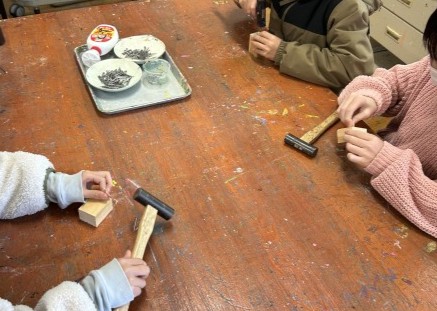 4年生に向け、図工室で授業を受けました。トンカチと釘を使い、オリジナルの「くぎちゃん」を作りました。