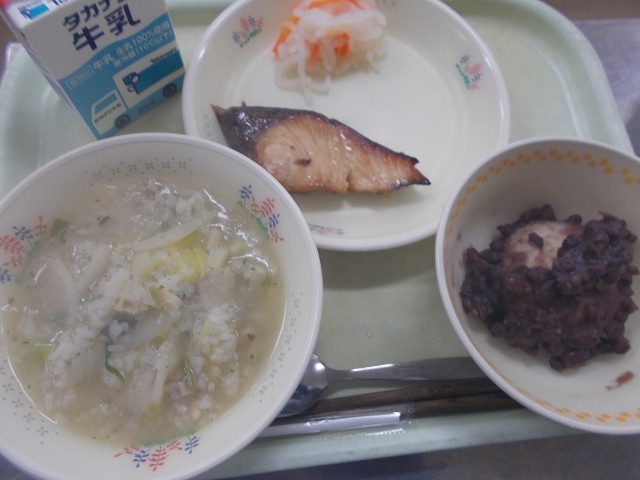 牛乳・七草ぞうすい・ぶりの照り焼き・紅白なます・豆腐入り白玉あずき【七草(1/7)・鏡開き(1/11)】