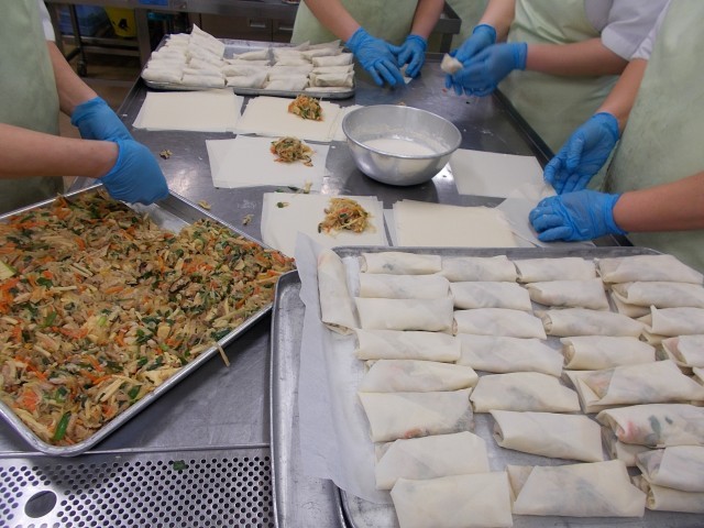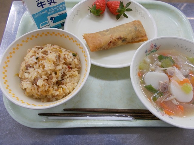 牛乳・キムタクごはん・春巻き・トックスープ・いちご