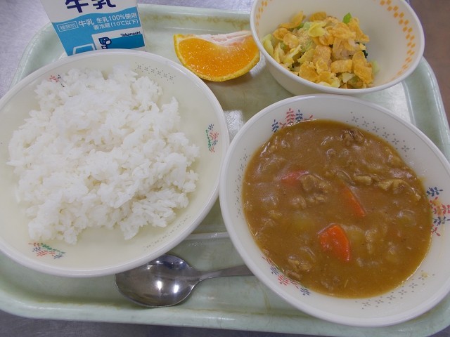 牛乳・ポークカレーライス・コーンフレークのフレンチサラダ・デコポン
