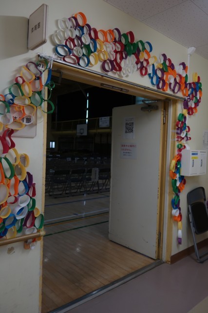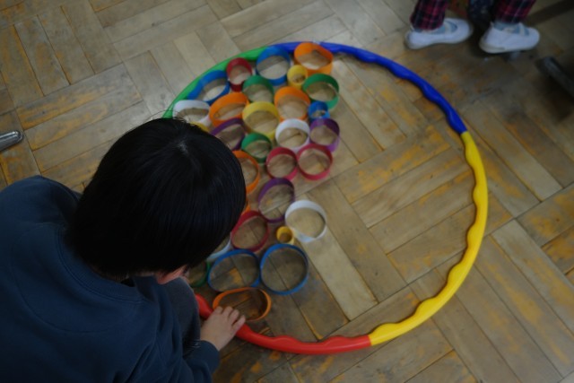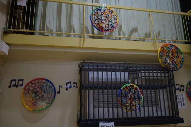 音楽発表会のために、体育館の飾りを2年生が作りました。とてもはりきって作り、フラフープの中に色とりどりの飾りを敷き詰めていきました。