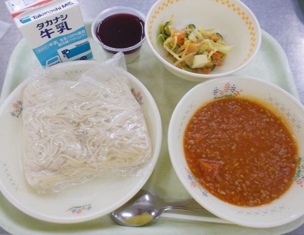 【タイムスリップ給食】牛乳・ソフト麺・ミートソース・ポテト入りマスタードサラダ・二色ゼリー