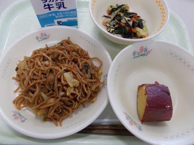 牛乳・ソース焼きそば・焼きいも・青大豆とひじきのサラダ