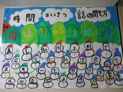 川上村の「空」「山」「雪だるま」を想像し、みんなで考えたスローガンを旗の中にデザインしました。実行委員は、休み時間や放課後の時間を利用して素敵な旗を作り上げることができました。