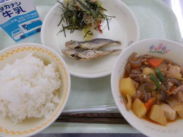 牛乳・ごはん・豆あじのから揚げ・韓国風肉じゃが・チョレギサラダ