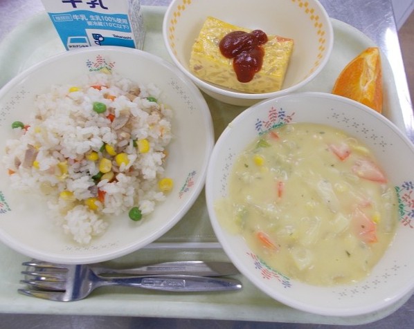 牛乳・コーンピラフ・ポテト入りオムレツ・白菜とコーンの豆乳スープ・せとか