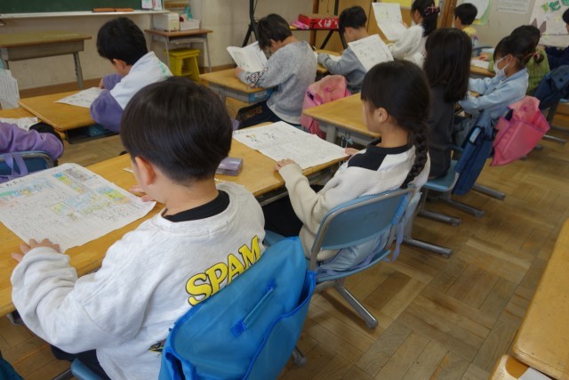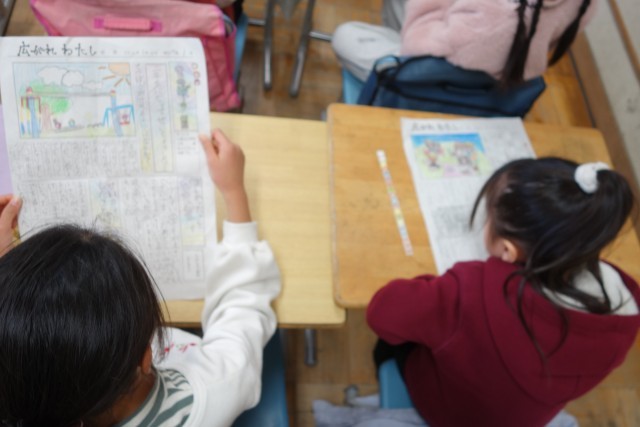 生活科「広がれわたし」では、これまでの自分の成長を振り返りながら、「自分新聞」を作ってきました。1組と2組が合同で、完成した新聞を読み合い、交流会を行いました。お互いの成長に驚いたり共感したりする声が聞こえてきました。