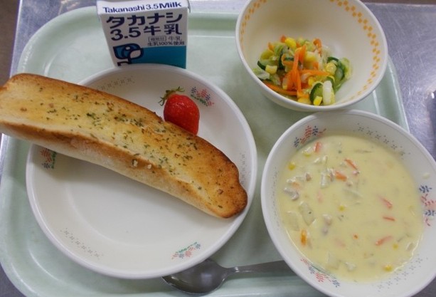 牛乳・ガーリックトースト・コーンチャウダー・バジルドレッシングサラダ・いちご