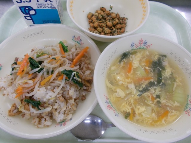 牛乳・ビビンバ・青のりビーンズ・チンゲン菜とたまごのスープ