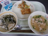 今日の給食は、カリカリお豆ご飯・じゃがいものそぼろ煮・かみかみサラダ・柿・牛乳でした。今日は11月8日の「いいは」にちなんだ「かみかみメニュー」でした。カリカリお豆ご飯は、よく噛みしめると豆の甘みが感じられ、とても美味しかったです。かみかみサラダも柿もいつもよりしっかり噛んでいただきました。よく噛むと、唾液がたくさん出てむし歯を予防してくれたり、あごが強くなって歯並びがよくなったりする効果もあるそうです。今日もごちそうさまでした。