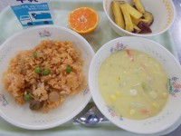 今日の給食は、中華風炊き込みご飯・生揚げ入りごまサラダ・トックスープ・美生柑・牛乳です。スープには「トック」という韓国のお餅が入っていました。白くて薄い団子のような食感です。日本のお餅のようにのびないのは、「うるち米」というお米を使っているからだそうです。トックスープはとっても美味しかったです。中華風炊き込みご飯は、干ししいたけ・たけのこ・人参・グリンピースなど具沢山で、旨味が最高でした。ふっくら炊きあがった炊き込みご飯をいただいて、もりもり元気になりました。