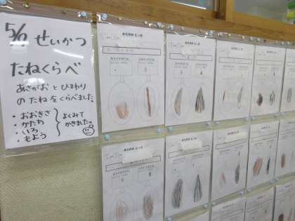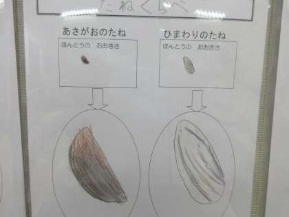あさがおとひまわりの種を観察しました。2つの種を比べて、その違いを見つけながら描きました。