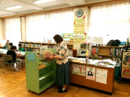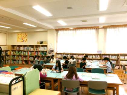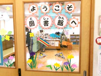 本校の図書室は2階にあります。図書室の入口はいつもカラフルです。図書指導員さんが季節に合わせた飾り付けをしてくださっています。子供たちが図書室に行くのを楽しみにしているのが分かります。この日は3年生の図書の時間でした。子供たちは、静かに読書をしていました。ゆったりとした時間が流れていました。