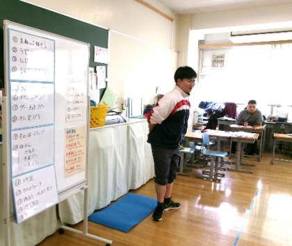 サポートルームでは、体幹を鍛える運動に取り組んでいます。続けて取り組むと、姿勢が良くなったり、集中力が高まったりするそうです。この日はさまざまな種類の運動にチャレンジしていました。つま先を外側に向ける運動は、ふらふらしないように立つことがポイントです。みんな真剣に練習していました。