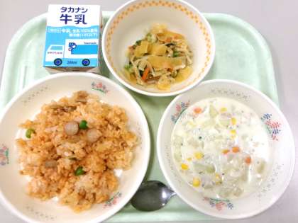 今日の給食は、チキンライス・パリパリワンタン入りサラダ・米粉ポタージュ・牛乳です。今日のサラダは、野菜の上にパリパリに揚げたワンタンの皮がトッピングされていました。野菜が美味しくいただける工夫が嬉しいです。今日はチキンライスやポタージュにたくさんの玉ねぎが使われていました。特にポタージュは、玉ねぎのやさしい甘さが感じられました。給食室へのお手紙に「ぜんぶおいしかったです。」と感想を書いている子供たちがいました。本当に、いつも全部美味しいです。