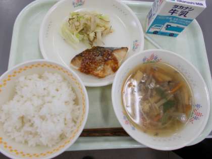 今日の給食は、さばのごま味噌だれ・沢煮椀・浅漬け・ご飯・牛乳です。今日の汁物は沢煮椀といって、豚肉・大根・にんじん・たけのこ・ごぼう・えのきだけ・油揚げなどが入った具沢山の汁物です。食物繊維がたっぷりで、腹の調子を整えてくれる効果があります。さばのごま味噌だれは、オーブンで焼いたさばにごま味噌をかけたものです。白すりごまをたっぷり入れて練り上げたごま味噌は、濃厚な味わいでした。このごま味噌でご飯がいくらでも食べられると思う美味しさでした。