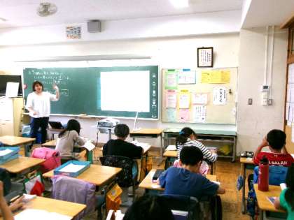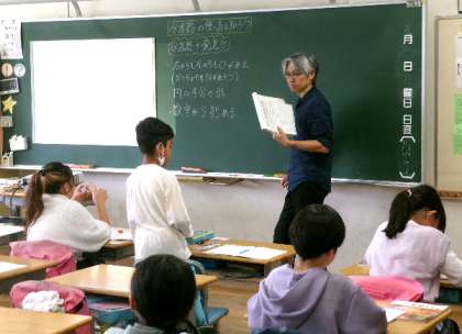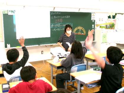 4年生は分度器の学習をしていました。分度器の目盛りの読み方について、黒板に大きく映しながら勉強しています。自分の考えを積極的に発表して、元気よく意欲的な4年生です。
