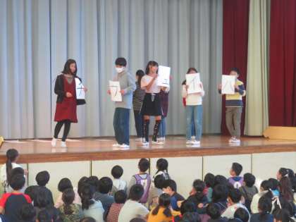 集会委員が舞台で、文字を書いた紙をもっています。1周する間に文字を並べ替えて言葉にしました。班長を中心に話し合って言葉にしていました。