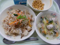 牛乳・カリカリお豆ごはん・焼きししゃも・肉じゃが・かみかみサラダ【カミカミメニュ...