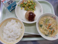 【おはなし給食】牛乳・ごはん・ハンバーグ・バジルドレッシングサラダ・たまごスープ
