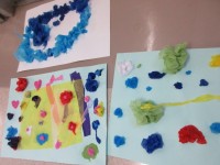 絵の具を厚紙でひっぱって、レインボーのように伸ばしました。別の画用紙には、絵の具を垂らして半分に折り、開くと不思議な模様が出来上がります。そこに目玉を付け、妖精に見立てました。すてきな、ワンダーランド...