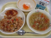ジャンバラヤ 魚のバーベキューソース キャベツスープ みかん ぎゅうにゅう【まち...