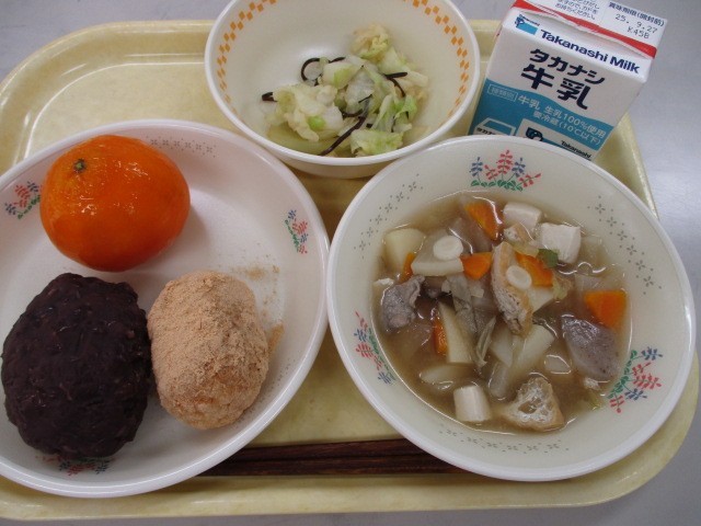 2色おはぎ キャベツの昆布和え 豚汁 冷凍みかん ぎゅうにゅう
