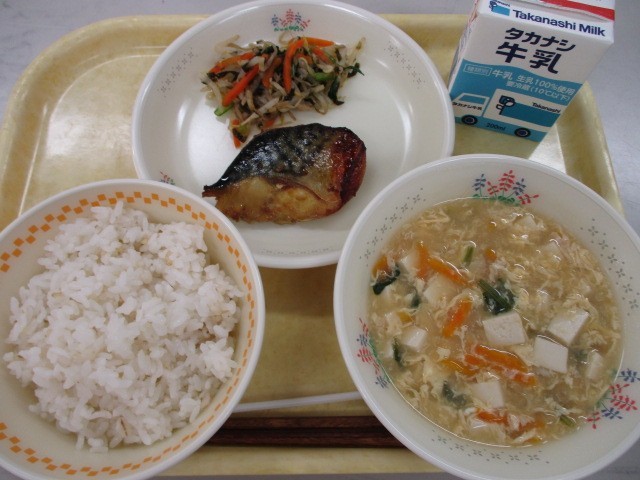 七穀米ごはん さばのカレー焼き 磯香あえ かきたま汁 ぎゅうにゅう