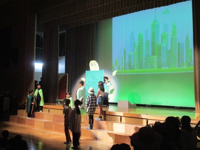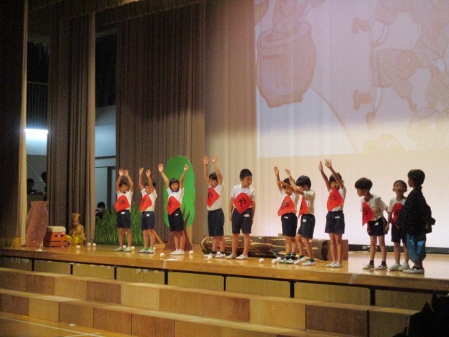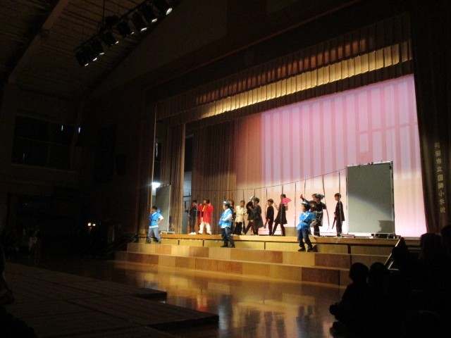 いよいよ学芸会の本番、児童鑑賞日です。前半の部は、3年生、1年生、5年生の順に演じました。たくさんの人たちの前で舞台に立ち、大きな声を出すことはとても緊張することと思います。そんなプレッシャーに打ち勝ち、皆練習の成果を存分に発揮していました。会場の笑いを誘う場面もたくさんあり、体育館中が微笑ましい雰囲気に包まれていました。