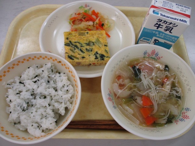 わかめごはん 千草焼き まち☆ベジたくあんの白菜漬け 吉野汁 ぎゅうにゅう