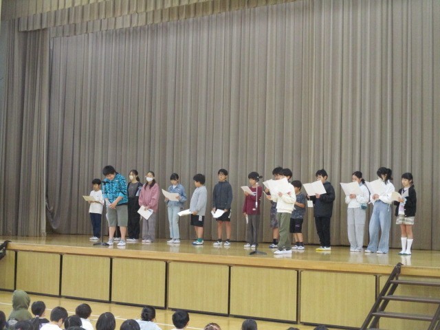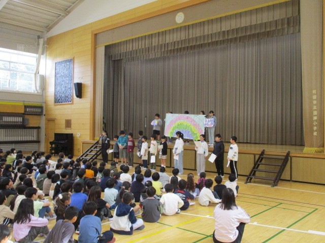 今週は秋の読書週間ということで図書委員会による発表集会があり、図書委員がオリジナルのお話を読み聞かせしてくれました。お話の中では、図書委員がおすすめする本の紹介もありました。また最後には、読書週間の期間に皆で取り組み完成した「読書の虹」のお披露目をしました。読書週間は終わりますが、これからも図師小の子供たちにはたくさんの本に日常的に親しんでほしいと願っています。