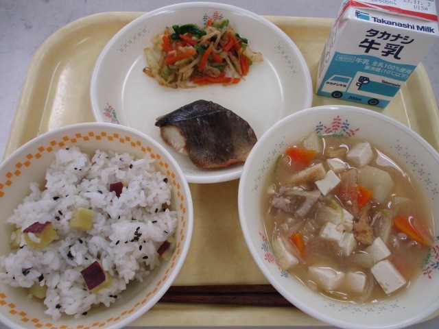 さつまいもごはん ほっけの塩焼き 小松菜のおかかあえ 呉汁 ぎゅうにゅう