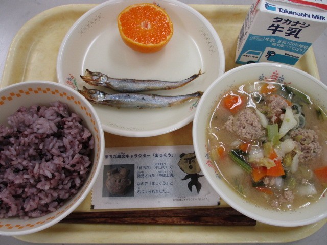 古代米ごはん まっくう海苔(のり) 焼きししゃも 白菜と肉団子のみそスープ 菊花みかん ぎゅうにゅう