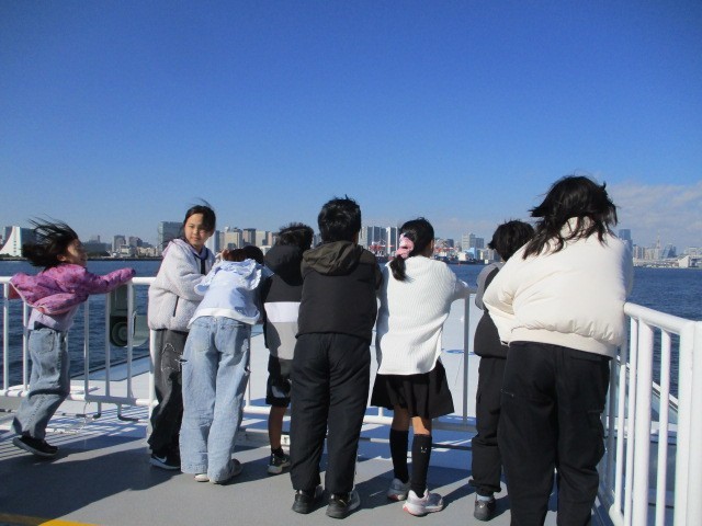4年生は、社会科で東京都について学習をしています。そこで今日は、東京港の有明ターミナルから水上バスに乗り、お台場、臨海副都心などを海上から見学しました。海風はひんやりしていましたが、港から見える荷下ろしをする船舶や、海の清掃を行っている船などを見ているとあっという間に降りる時間が来てしまいました。