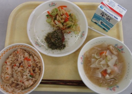 高野豆腐のそぼろごはん たこやきふうがんも キャベツのレモン風味 大根のみそしる ぎゅうにゅう