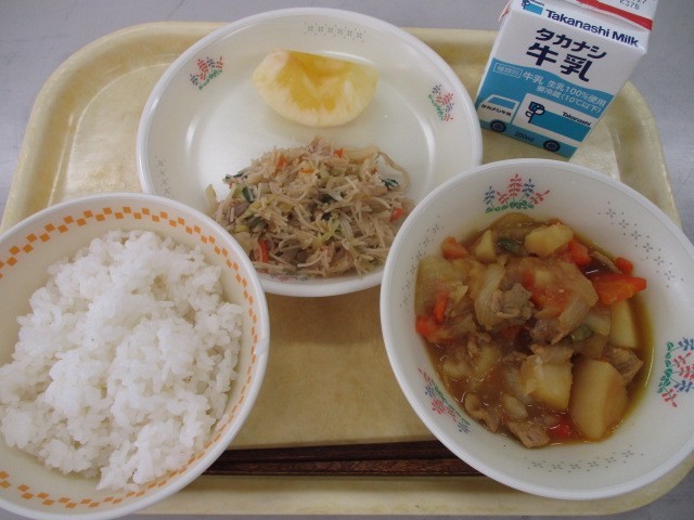 ごはん(コシヒカリ) カレーにくじゃが ビーフンソテー りんご(高徳) ぎゅうにゅう