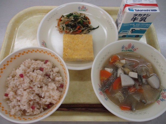 うめじゃこごはん 切り干し大根入り卵焼き 磯香あえ みそけんちん汁 ぎゅうにゅう