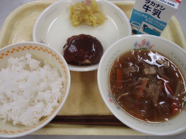 ごはん 豆腐ハンバーグ 焦がしオニオンスープ さつまいものりんご煮 ぎゅうにゅう