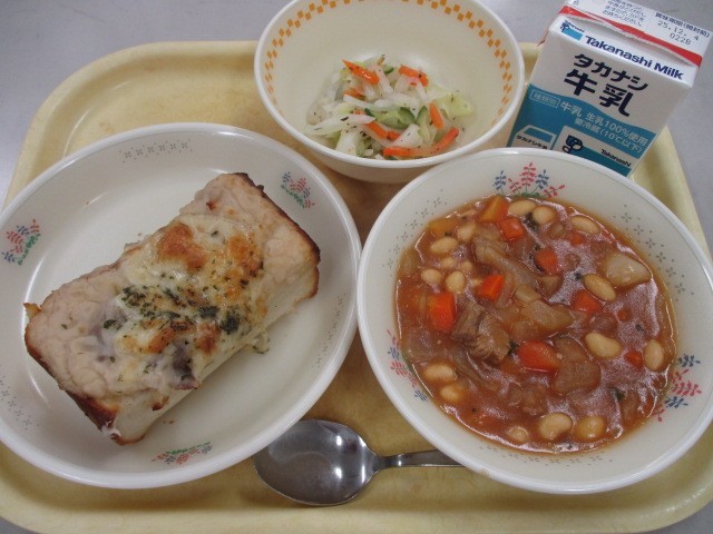この日は何といっても分厚いパン!!と、その上に乗った白いんげん豆のトーストを使って作った優しい味の具、チーズがとろけた見た目のインパクトが大きかったです。白いんげん豆はペーストを使用していたのですが、ミキサーでなめらかにして塗りやすくしたことがポイントで、優しくとろっとした食感になりました。1年生の学級では「(見た目が)グラタンみたい!」「パンの耳の少しとなりから食べて、パンの耳を途中で食べるといいよ」など、工夫しながらおいしくたべている声が聞こえました。