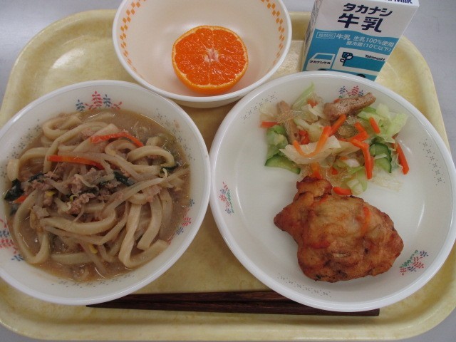 コク旨坦々うどん 手作りさつまあげ 糸寒天のさっぱりあえ 菊花みかん ぎゅうにゅう