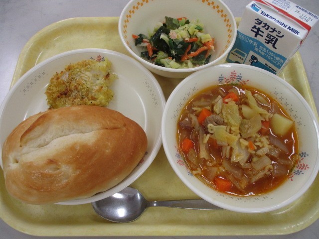 ソフトフランスパン 白身魚のパン粉焼き ツナレモンサラダ ミネストローネ ぎゅうにゅう