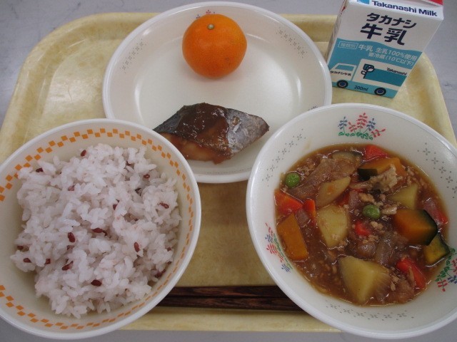 赤米いりごはん さわらのゆずみそ焼き ほくほくかぼちゃとじゃがいものそぼろに みかん ぎゅうにゅう