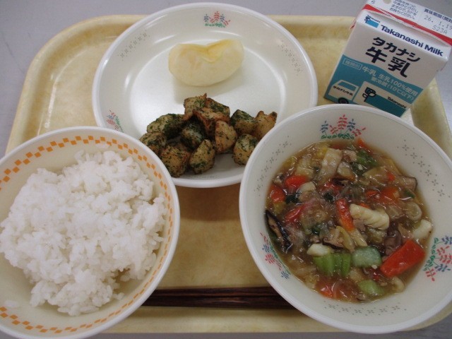 ごはん 中華風五目うま煮 青のりポテト りんご ぎゅうにゅう