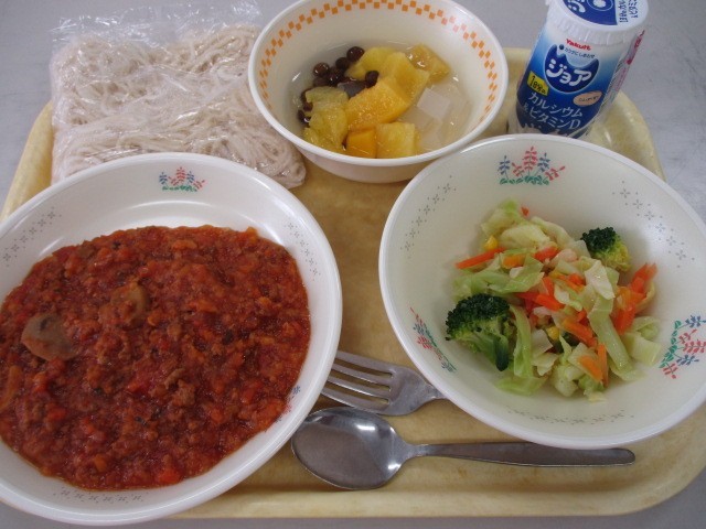 ソフト麺 ミートソース フレンチサラダ フルーツみつまめ ぎゅうにゅう