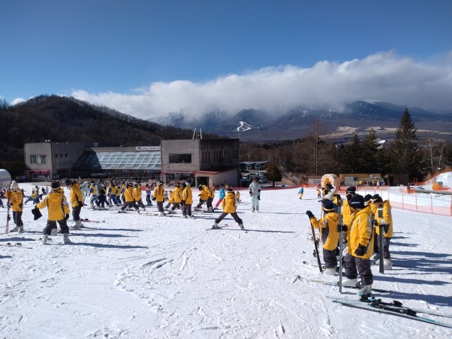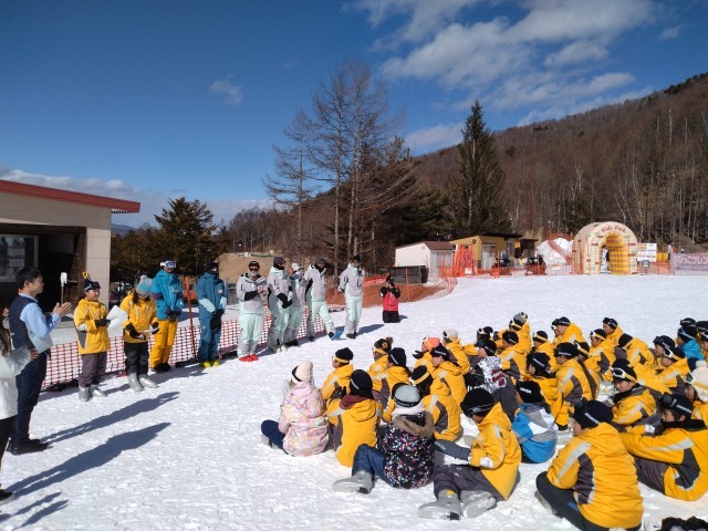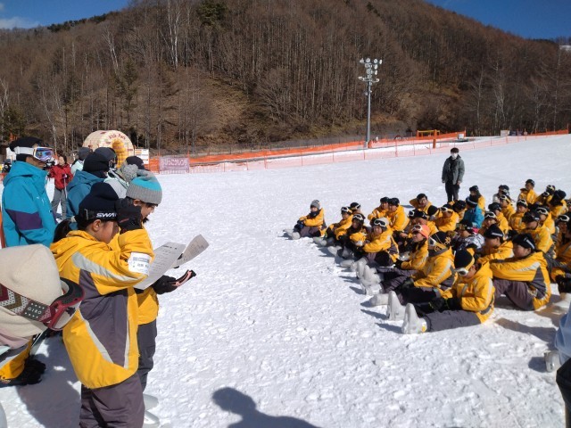 まずは皆でそろって開校式です。パウダースノーのゲレンデに立つと子供たちのテンションも一気に上がります。お世話になるインストラクターの先生方に挨拶をして、いよいよレッスン開始です。たっぷり2時間のレッスンで、皆が着実に自信を付けた1日目でした。明日は朝から早速リフトに乗るグループも多いと思います。