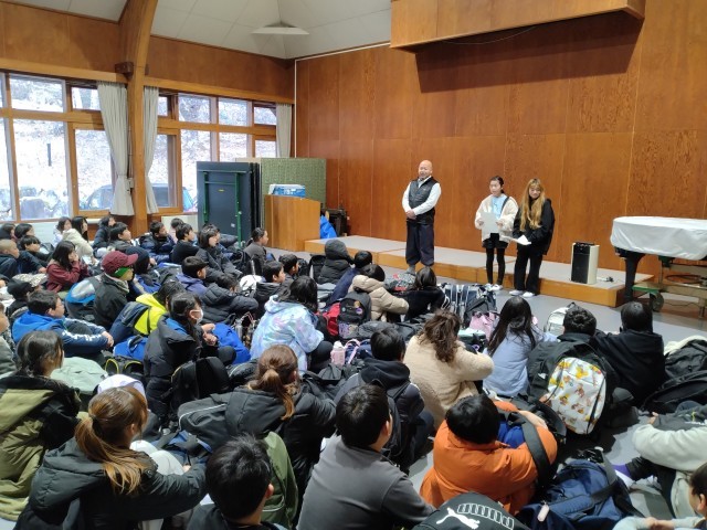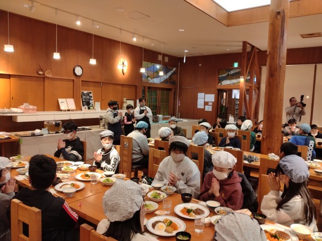 スキー場を後にして、宿舎の町田市自然休暇村に向かいます。広いホールで開村式を行い宿舎の方にご挨拶をしました。夕食の時間は、栄養たっぷりのおいしいごはんをたくさんいただき明日のスキーに備えます。その後は部屋の友達と楽しく過ごしたり、お土産タイムを楽しんだりと、あっという間に1日目が過ぎていきました。笑顔いっぱい、充実感いっぱいの最高の1日でした。